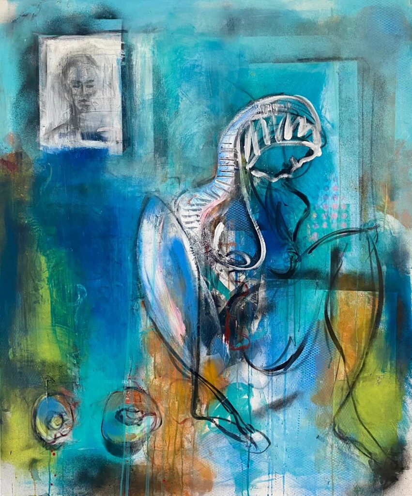 Una figura se repliega sobre sí misma, suspendida entre el azul y el silencio. Su cuerpo parece trazar una espiral de pensamiento, mientras un rostro, apenas esbozado en la esquina, la observa desde otra dimensión.