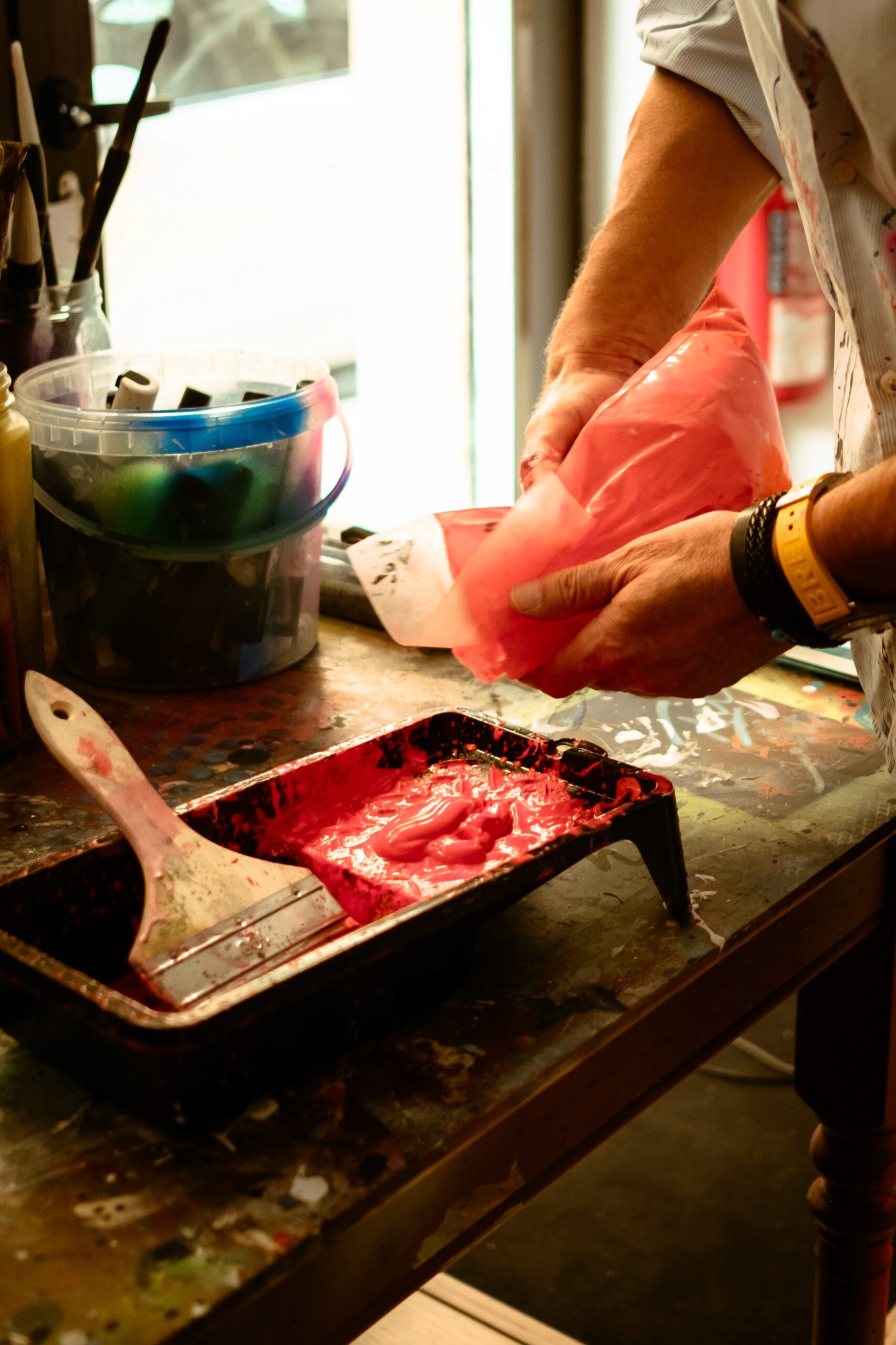 En lo alto, tres retratos en rosa intenso interrumpen la escena con una vibración casi violenta, recordando que la identidad es múltiple, fragmentada y a menudo contradictoria